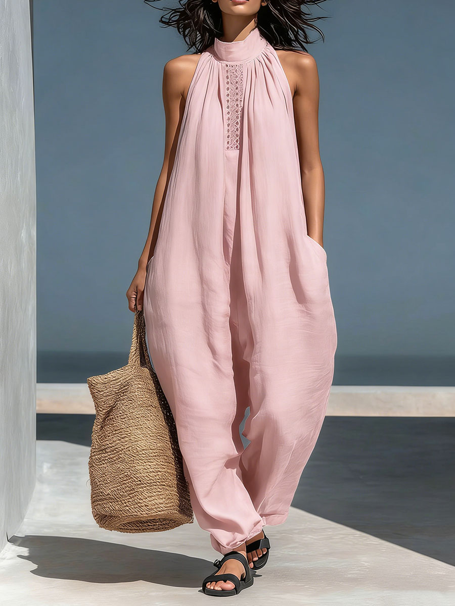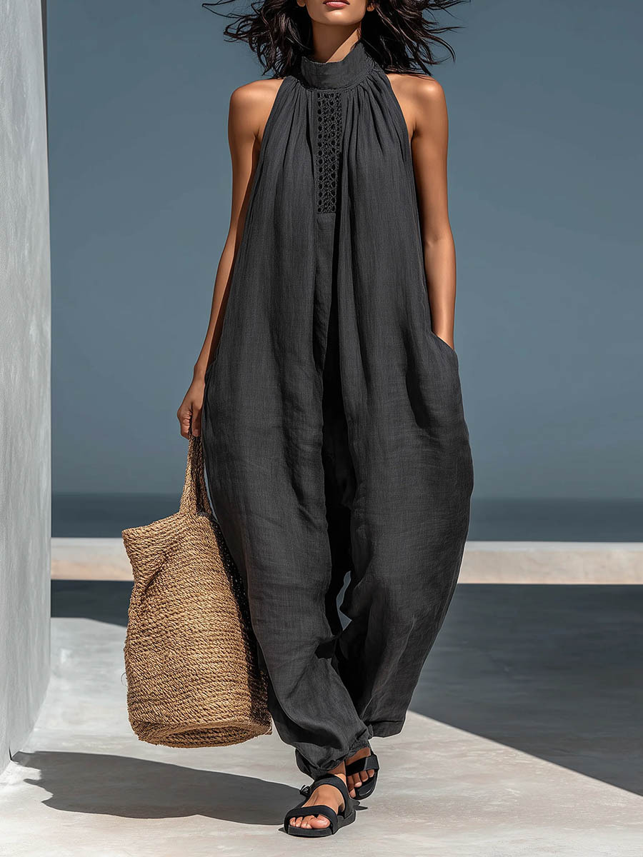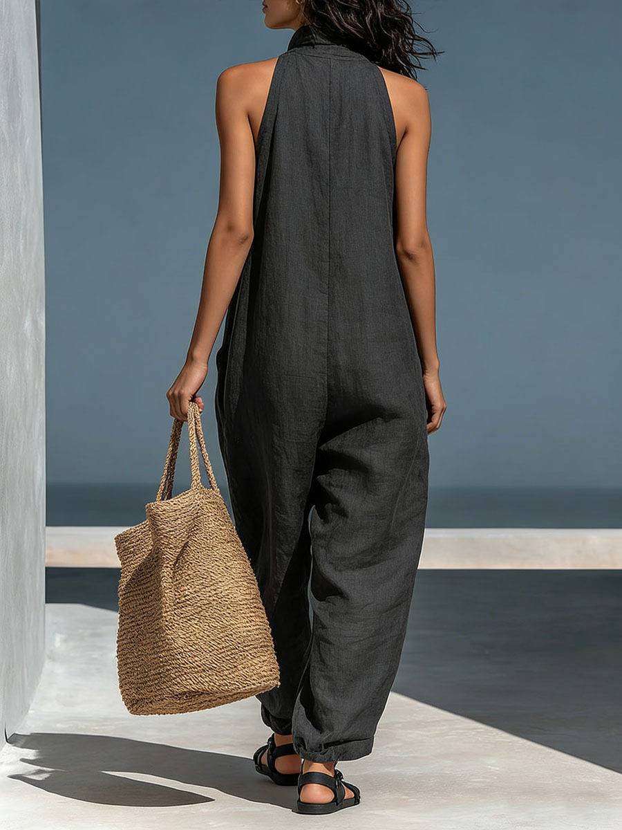 Women's Stand-up Collar Sleeveless Casual Loose Cotton And Linen Wide-leg Jumpsuit
