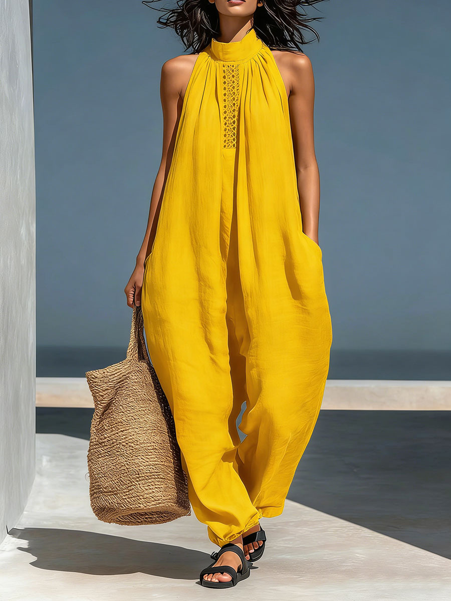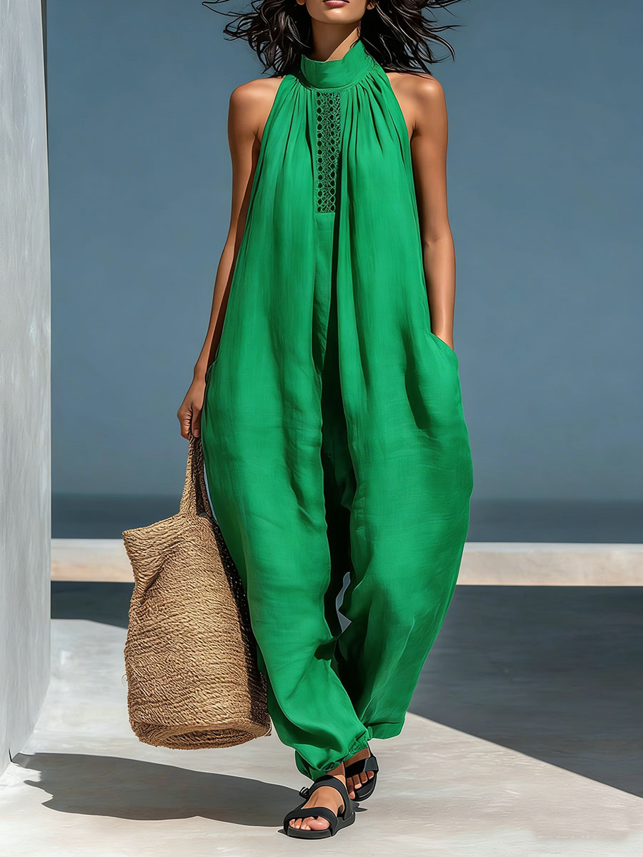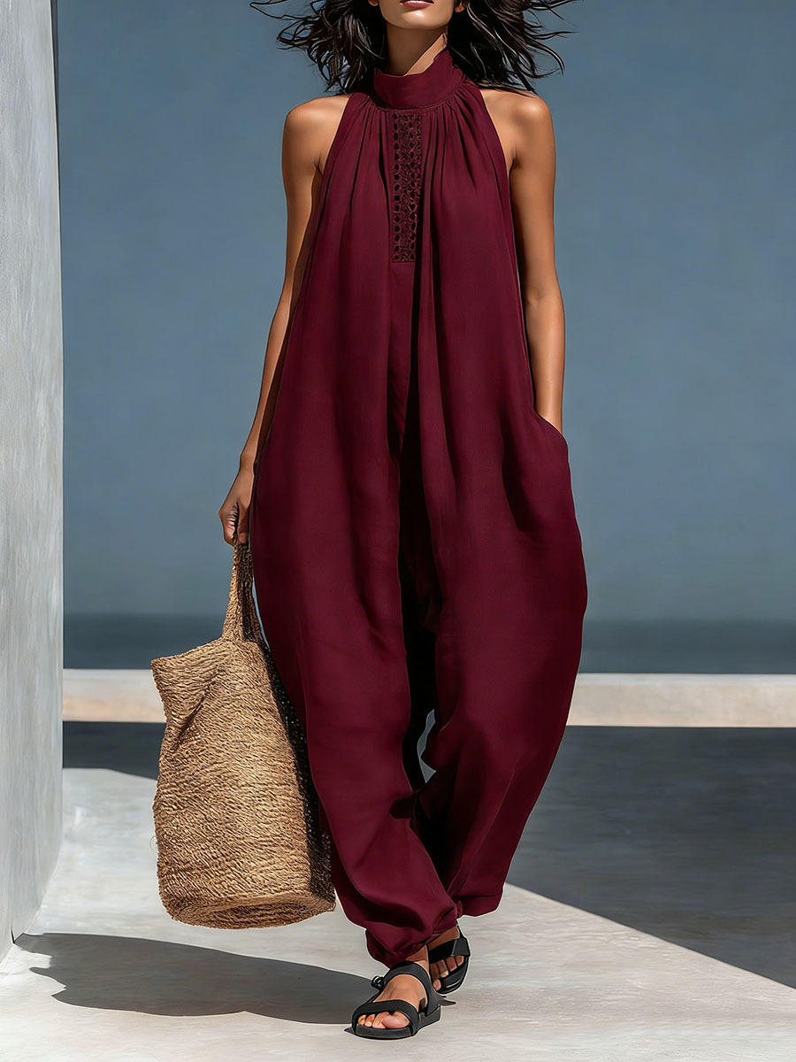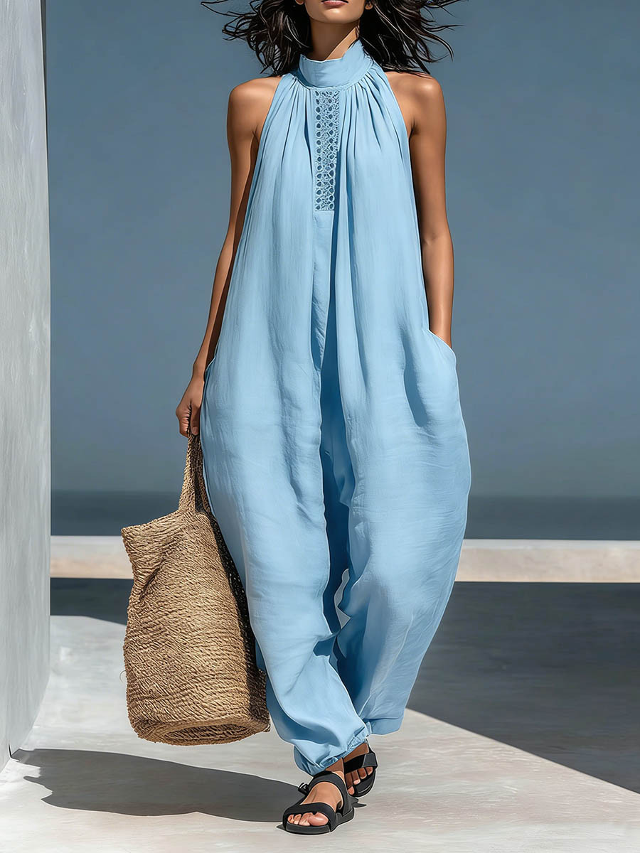 Women's Stand-up Collar Sleeveless Casual Loose Cotton And Linen Wide-leg Jumpsuit