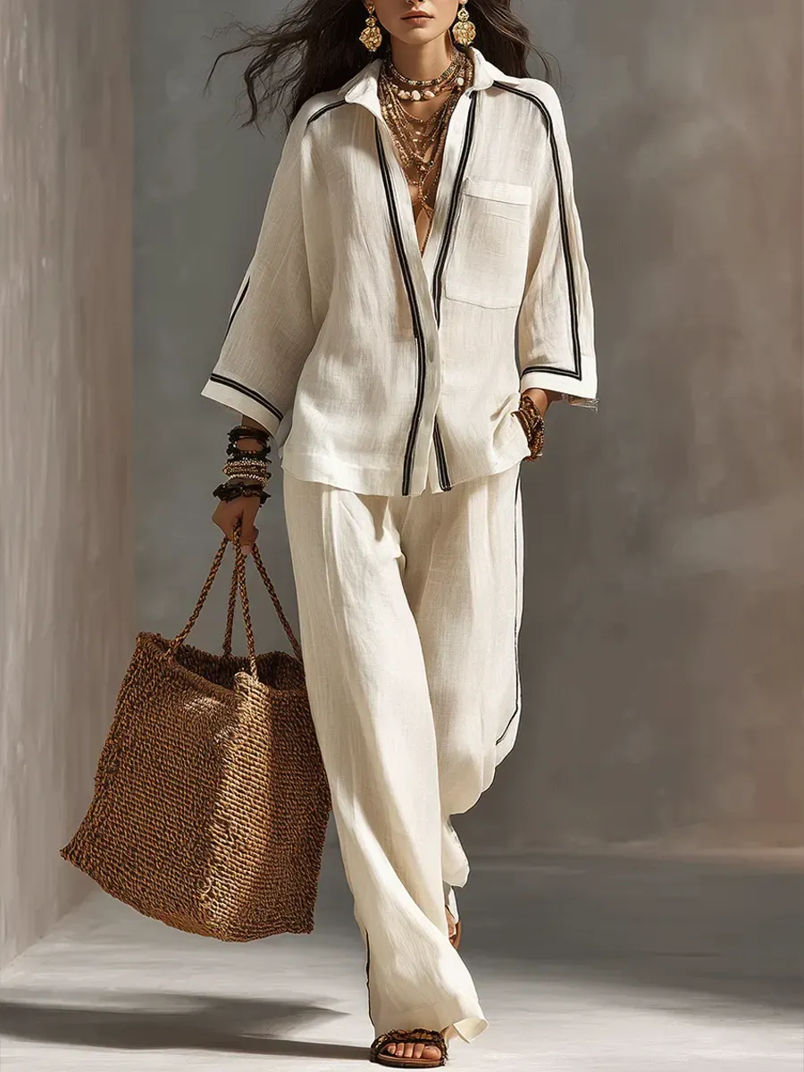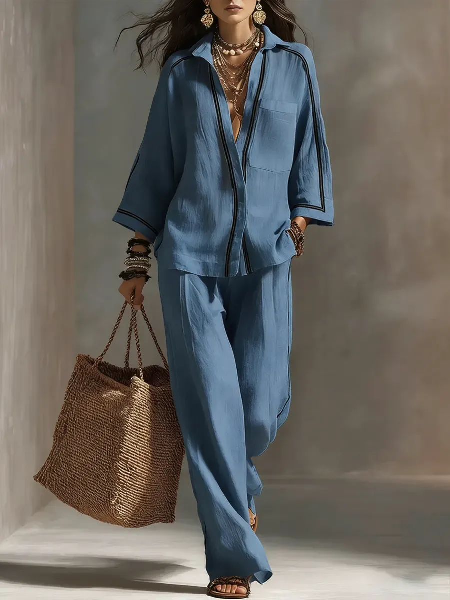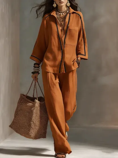 Women's Striped Decorative Shirt And Wide-leg Pants Set