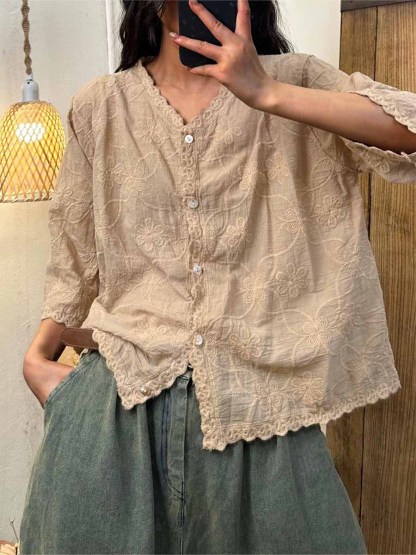Women's V-neck Half Sleeve Embroidered Cardigan Buttoned Casual Linen Top