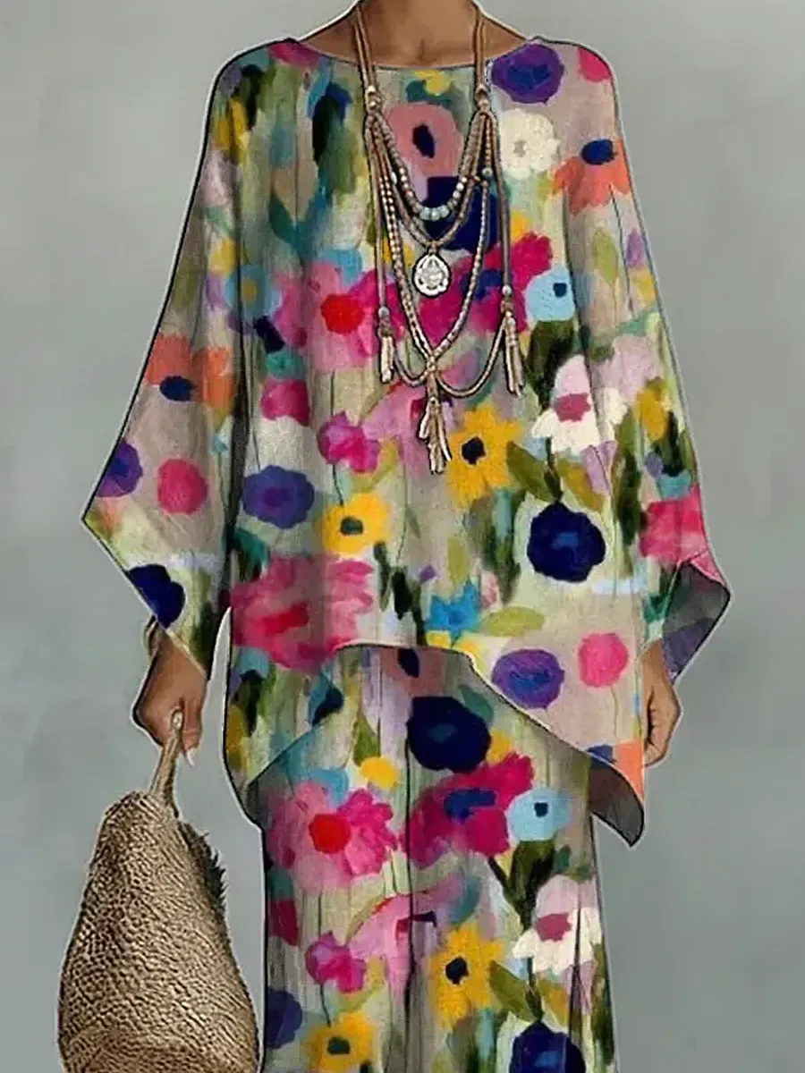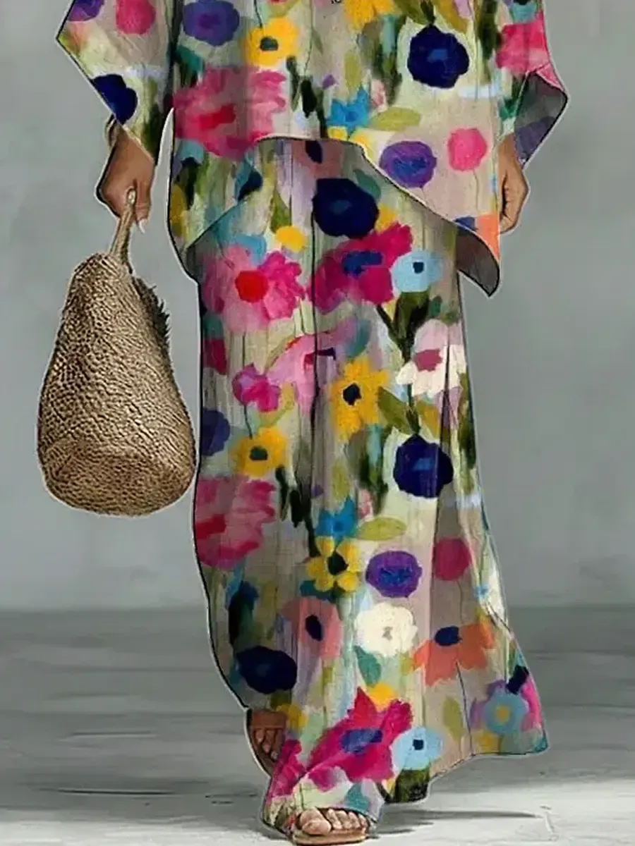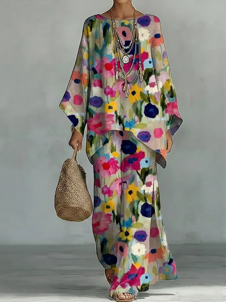 Women's Vintage Floral Art Comfortable Loose Cotton Linen Wide-leg Pants Two-piece Set