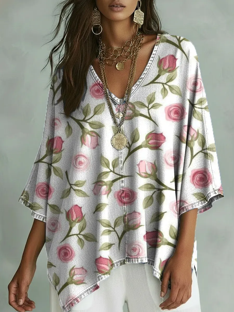 Women's Vintage Floral Art Print Casual Bat Sleeve Denim Shirt