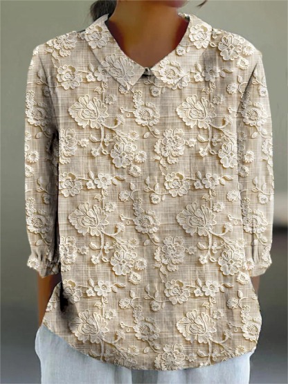 Women's Vintage Floral Art Print Casual Cotton And Linen 3/4 Sleeve Shirt