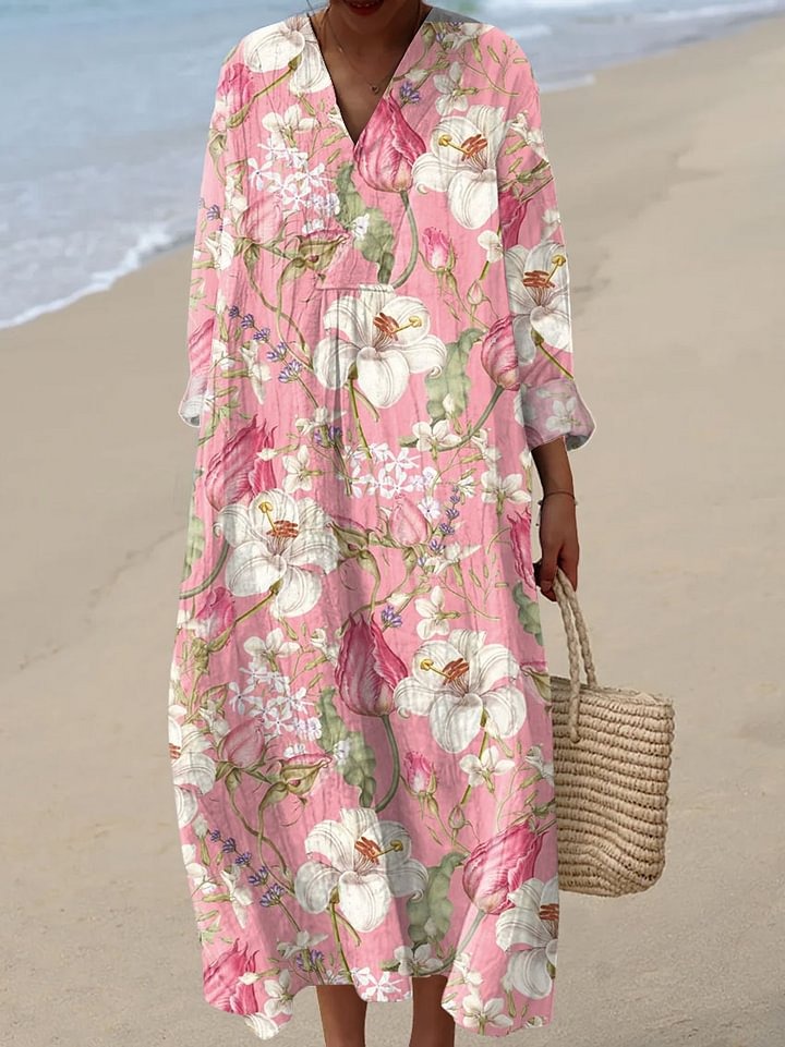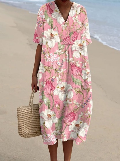 Women's Vintage Floral Art Print Casual Linen V-neck Shirt