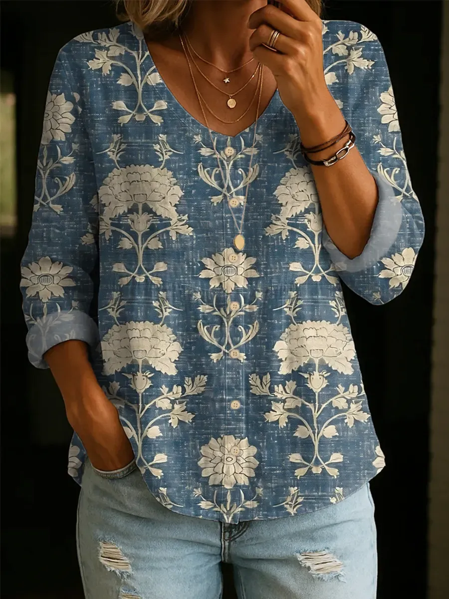 Women's Vintage Floral Pattern Art Print Casual Cotton Linen Shirt