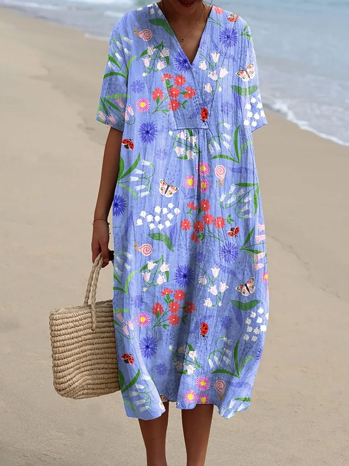 Women's Vintage Flower Art Print Casual Linen V-neck Shirt