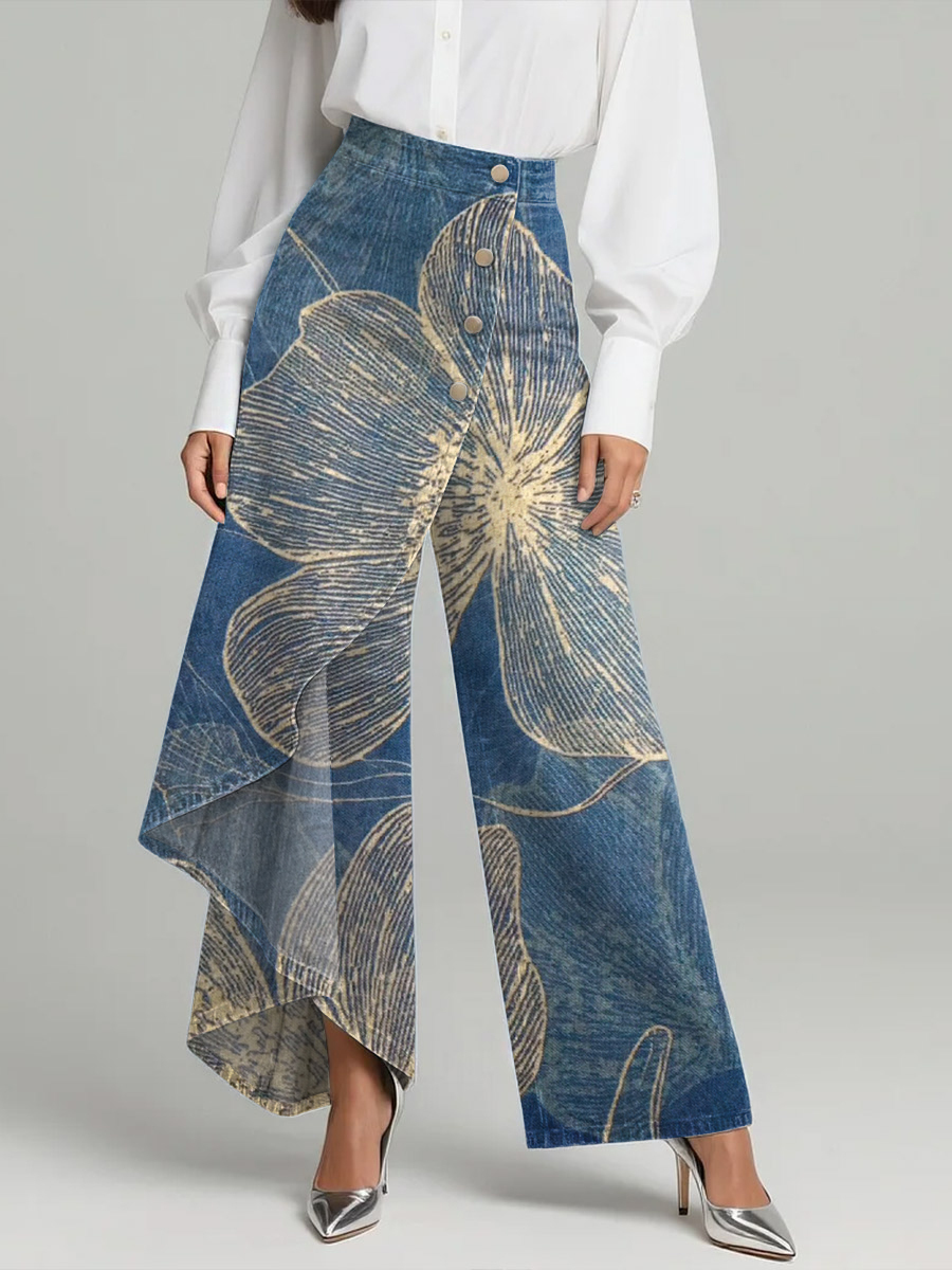 Women's Vintage Flower Patterns Print High-waisted Relaxed Fit Wide-leg Jeans With A Stylish Design